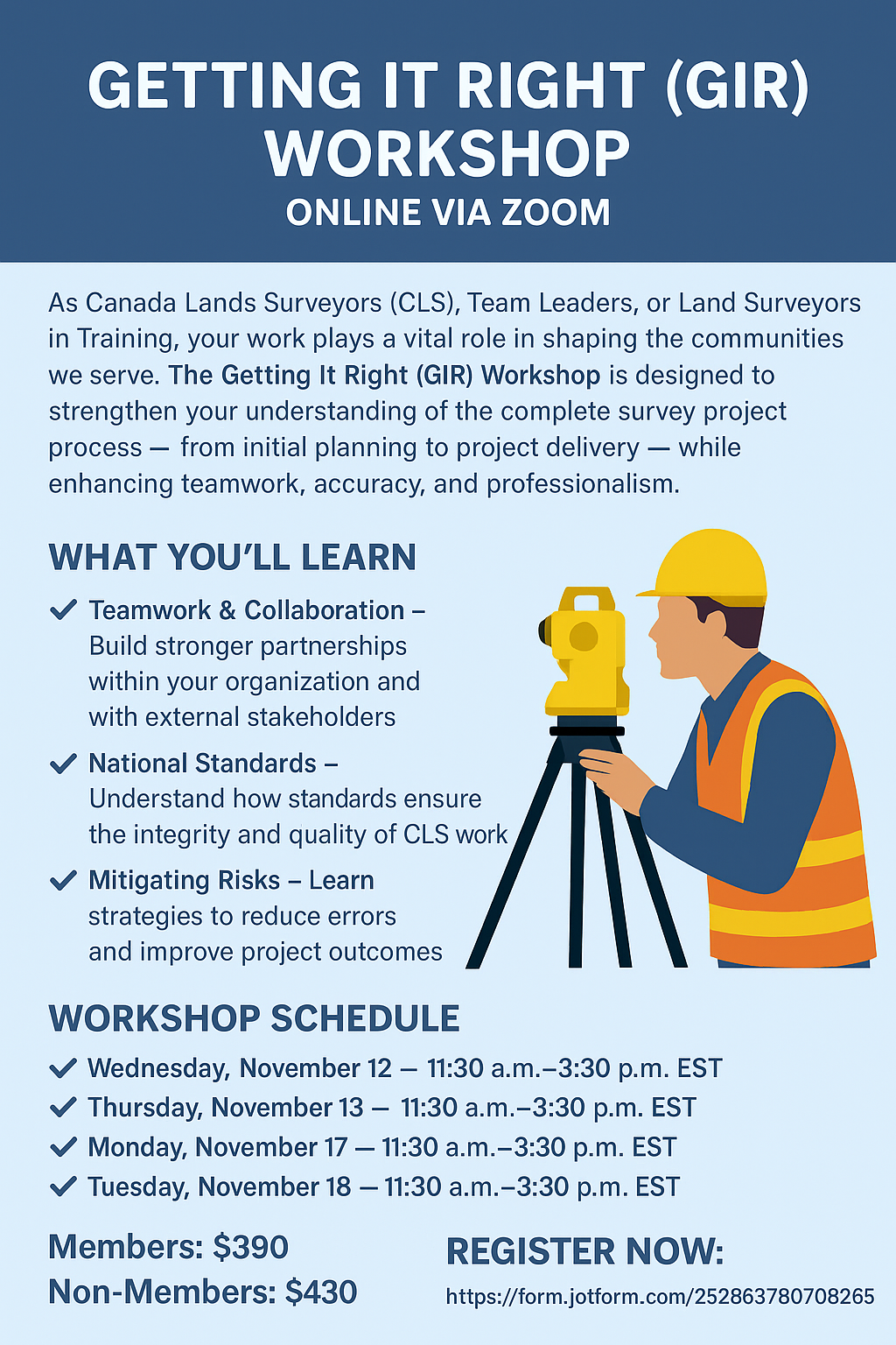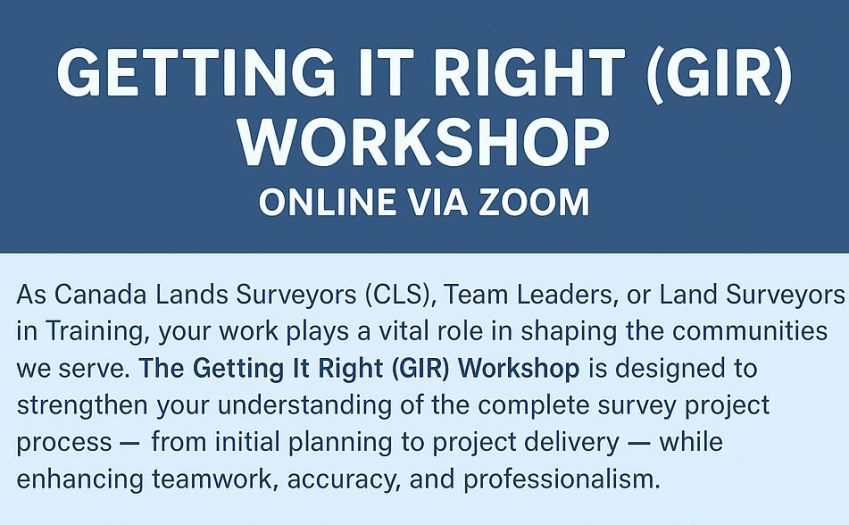 As Canada Lands Surveyors (CLS), Team Leaders, or Land Surveyors in Training, your work plays a vital role in shaping the communities we serve. The Getting It Right (GIR) Workshop is designed to strengthen your understanding of the complete survey project process β from initial planning to project delivery β while enhancing teamwork, accuracy, and professionalism.